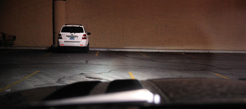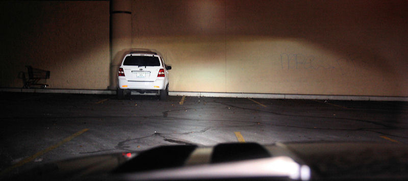 Residential street on dip-beam. Note that there is enough "spill" to illuminate the reflective street sign on the left.